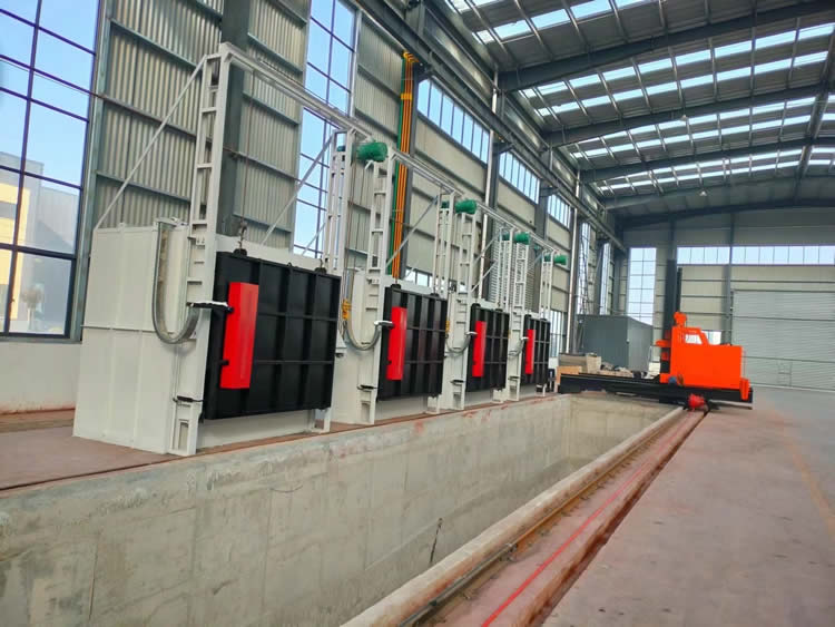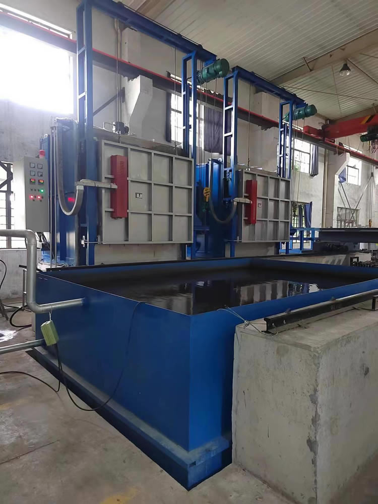 3、出爐淬火:按動出爐按鈕——中轉車移動到淬火爐爐口——爐門開啟——中轉車把工件叉出爐膛——中轉車后退并下降進入淬火介質——中轉車帶動工件在水中左右擺動(次數(shù)可調)——中轉車上升瀝水——淬火工作完成